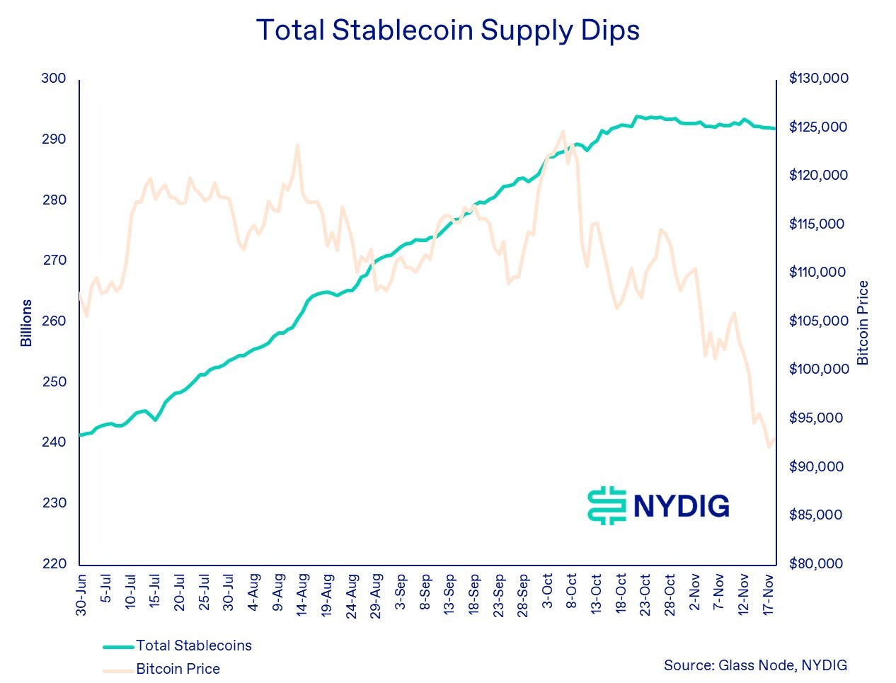- Stablecoin supply slipped, signaling liquidity leaving the system