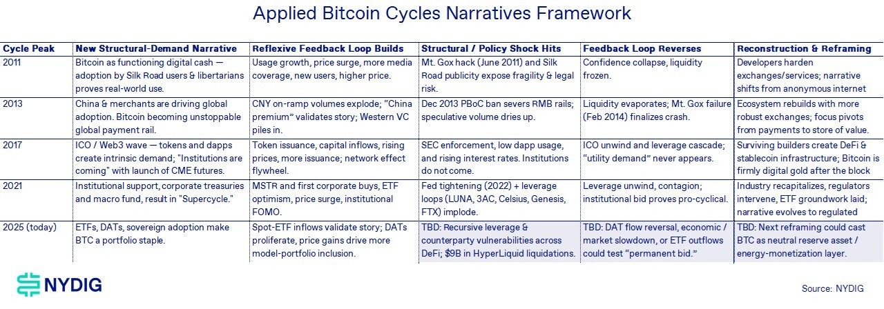 Our recent “Bitcoin Cycles Narratives Framework” has been one of the most useful lenses for understanding where we are in the market’s structural arc. Each major cycle follows the same pattern: a new demand narrative ignites, reflexive inflows build, a shock exposes leverage, feedback loops reverse, and the industry rebuilds around a new narrative. What’s striking today is how closely the current environment is tracking that script again.