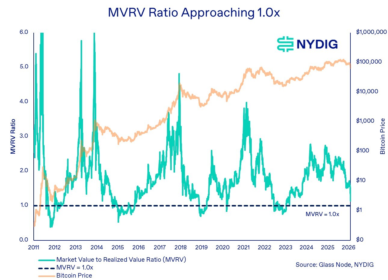 One of our long-standing favorite cyclical indicators, Market Value to Realized Value (MVRV), which compares bitcoin’s current price to the average cost basis of all coins (based on their last movement), is approaching levels historically associated with cycle bottoms. We’re not quite there yet. In every prior cycle drawdown, including the COVID-induced “Black Thursday” event, MVRV fell below 1.0x before a floor formed. While that threshold hasn’t been reached yet, we’re getting close. At present, a 1.0x MVRV corresponds to a bitcoin price of approximately $55,326.