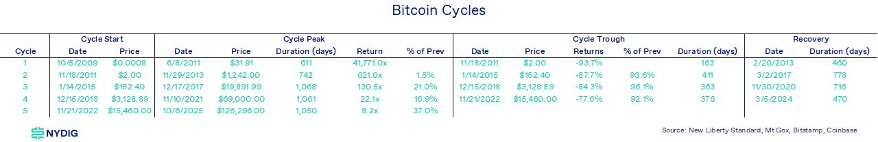 We believe the market is firmly in a cyclical drawdown consistent with bitcoin’s historical four-year cycle. Both the depth and duration of the decline support this view.