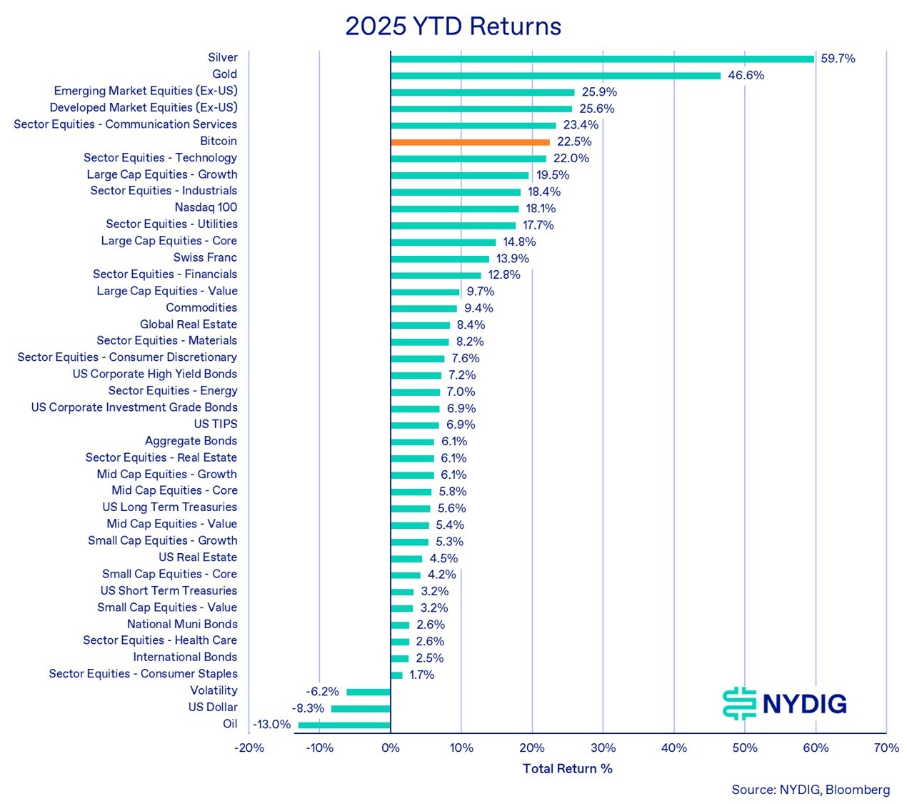 On a year-to-date basis, bitcoin is up 22.5%, still top quartile performance, but behind precious metals and certain equity sectors. Emerging and developed market equities got an early-year head start from the tariff and geopolitical turmoil with the new administration’s priorities and continued to add to their gains in Q3. U.S. technology stocks (Communication Services and Technology) have been the darling this year, with AI investments and narratives dominating stocks.