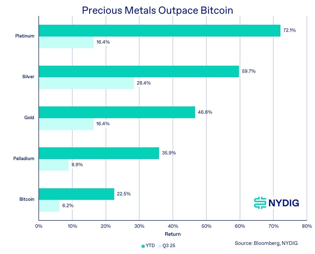 Because the share of annual supply used for store-of-value or investment purposes (bars, coins, jewelry, central bank holdings) is much smaller for platinum (<10%) and palladium (<5%), compared with roughly 90% for gold and 20% for silver, their strong performance is noteworthy.