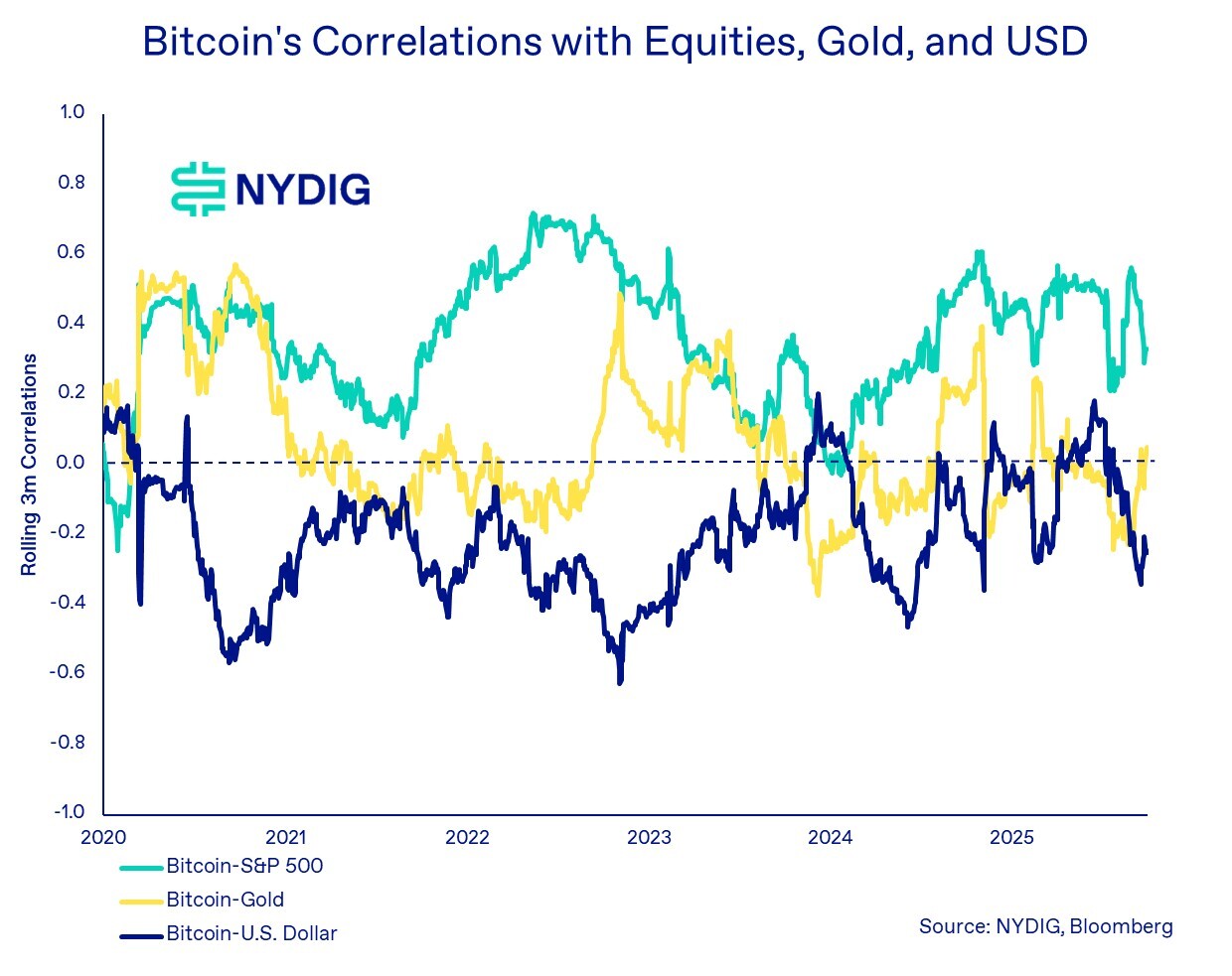 Correlations with gold oscillated around 0.0, suggesting bitcoin has yet to consistently trade as a “digital gold.” Correlations with the U.S. dollar remained slightly negative, ending the quarter at -0.25, as bitcoin tends to strengthen when the dollar softens.