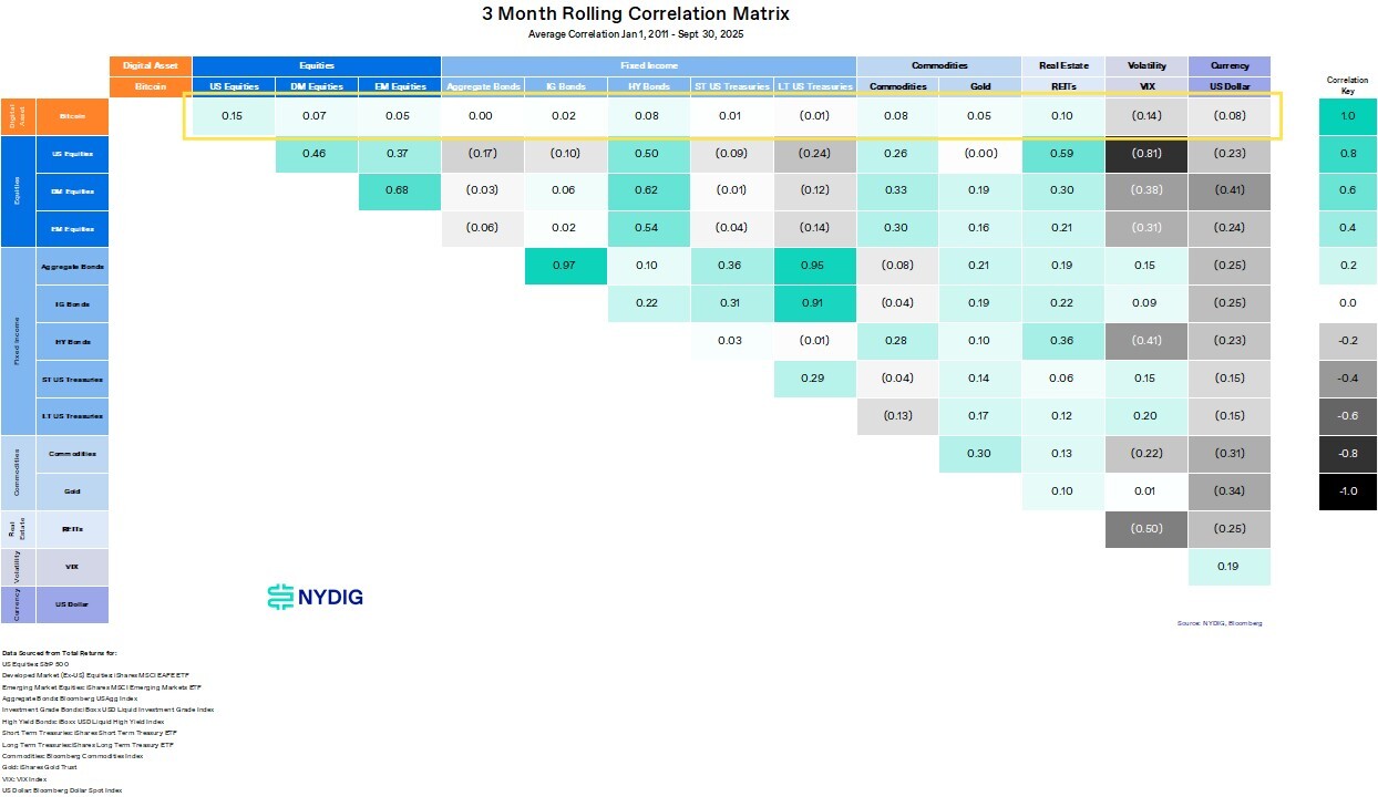 Bitcoin’s correlations with U.S. equities remained persistently elevated this quarter, despite periods of volatility in both crypto and equity markets. The 90-day rolling correlation with U.S. equities ended the quarter at 0.33, down from prior peaks earlier in the cycle but still notably above pre-COVID norms, when correlations typically hovered near zero. This sustained linkage highlights how macro and liquidity factors continue to drive cross-asset behavior.