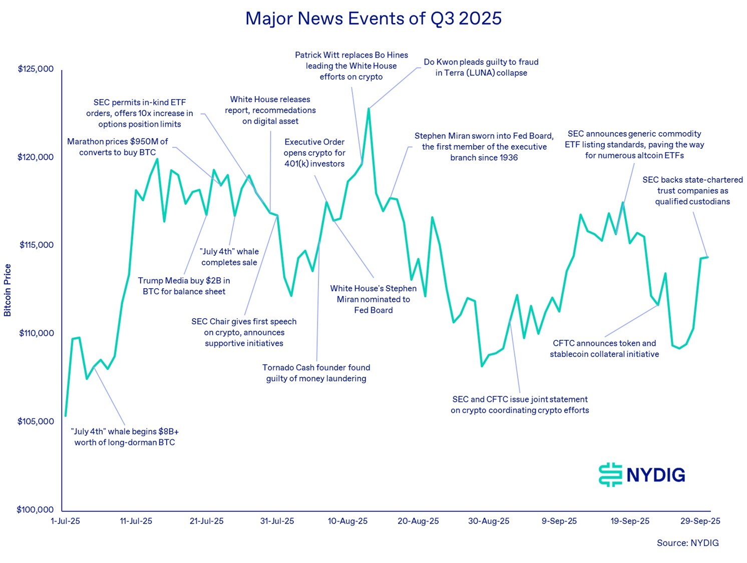 - The proliferation of DATs was the most significant market development this quarter, but most underperformed BTC due to liquidity unlocks and investor concerns about the premium to NAV durability.