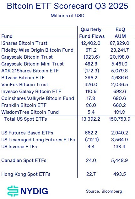 BlackRock’s iShares Bitcoin Trust (IBIT) remains the standout performer among U.S. spot Bitcoin ETFs, further extending its lead over competitors this quarter. The fund attracted $12.4 billion in inflows, accounting for nearly 93% of total net flows into the U.S. spot bitcoin ETF complex. With recent increases to options position limits, where IBIT was already the clear leader, the fund’s position as the dominant vehicle for Bitcoin exposure appears even more firmly entrenched.