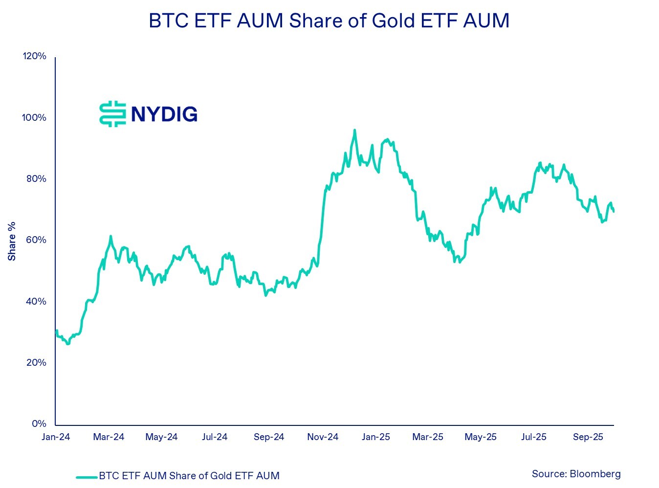 As of yesterday, U.S. spot bitcoin ETFs collectively hold nearly $165 billion in assets under management (AUM), a figure we significantly underestimated ahead of their launch. For context, U.S. spot gold ETFs total approximately $235 billion in AUM, meaning bitcoin ETFs represent more than 70% of the size of the gold ETF market. Bitcoin ETF's share of gold ETFs isn’t at its all-time high, but it's secularly growing with some cyclical ups and downs.