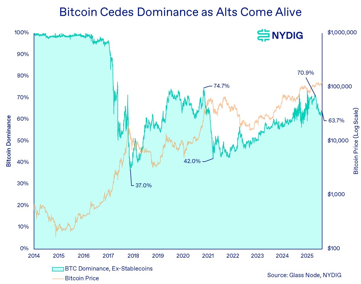 Bitcoin’s dominance, its share of the total crypto market capitalization, remains, in our view, a valuable cyclical indicator. Historically, at market peaks, speculative excess has driven altcoins to outsized gains, often far outpacing bitcoin’s performance, even as bitcoin itself reaches new all-time highs. This exuberance typically leads to a sharp decline in bitcoin’s dominance as capital floods indiscriminately into smaller tokens.