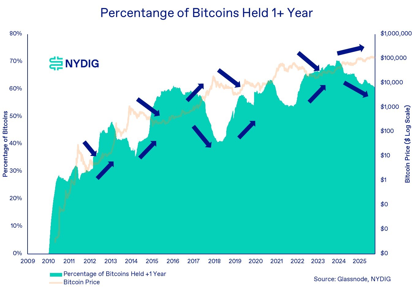 The percentage of bitcoin held for one year or longer also appears to carry cyclical significance. Historically, as prices rise, long-term holders tend to move or sell coins, realizing gains from appreciation. Conversely, during price declines, investors typically accumulate and hold coins for extended periods, increasing the share of long-term holdings. In the current cycle, that share has indeed declined as prices have risen, consistent with past behavior.